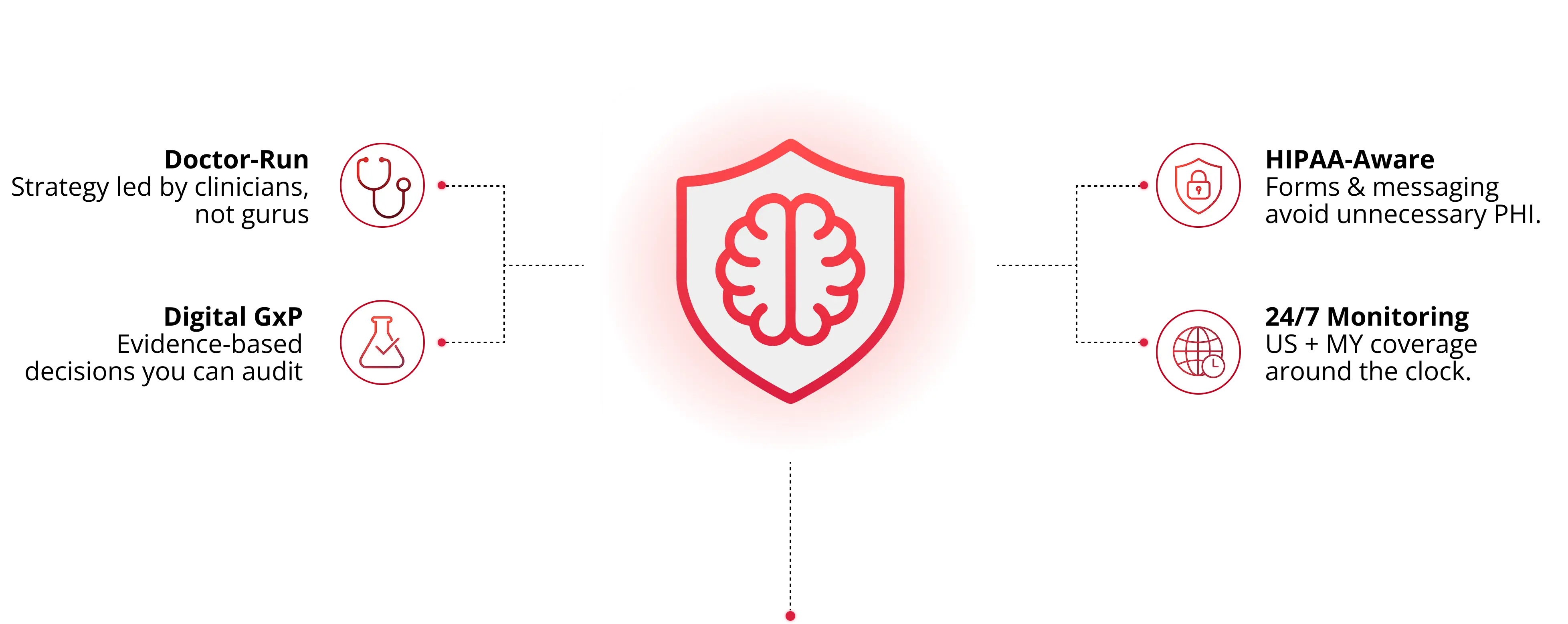 We use privacy-aware workflows, avoid collecting PHI in marketing forms, and follow consent-based outreach. For US healthcare, we don’t claim full HIPAA compliance of the platform; we minimize PHI and can advise safer setups. For Malaysia, we align with PDPA best practices.